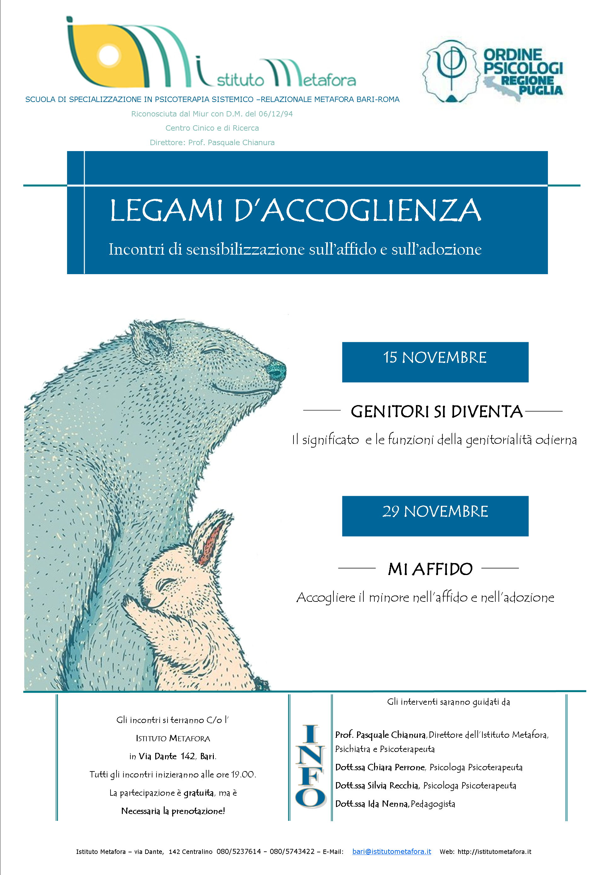 Doppio appuntamento organizzato dall'Istituto Metafora e patrocinato dall'Ordine degli Psicologi di Puglia per parlare di delicati temi quali l'affido e l'adozione. "Legami d'accoglienza: incontri di sensibilizzazione sull'affido...
