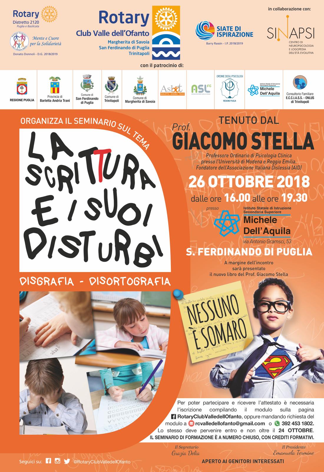 Il Prof. Giacomo Stella terrà il seminario "La scrittura e i suoi disturbi. Disgrafia e disortografia" organizzato dal Rotary Club Valle dell'Ofanto con il patrocinio dell'Ordine degli Psicologi...