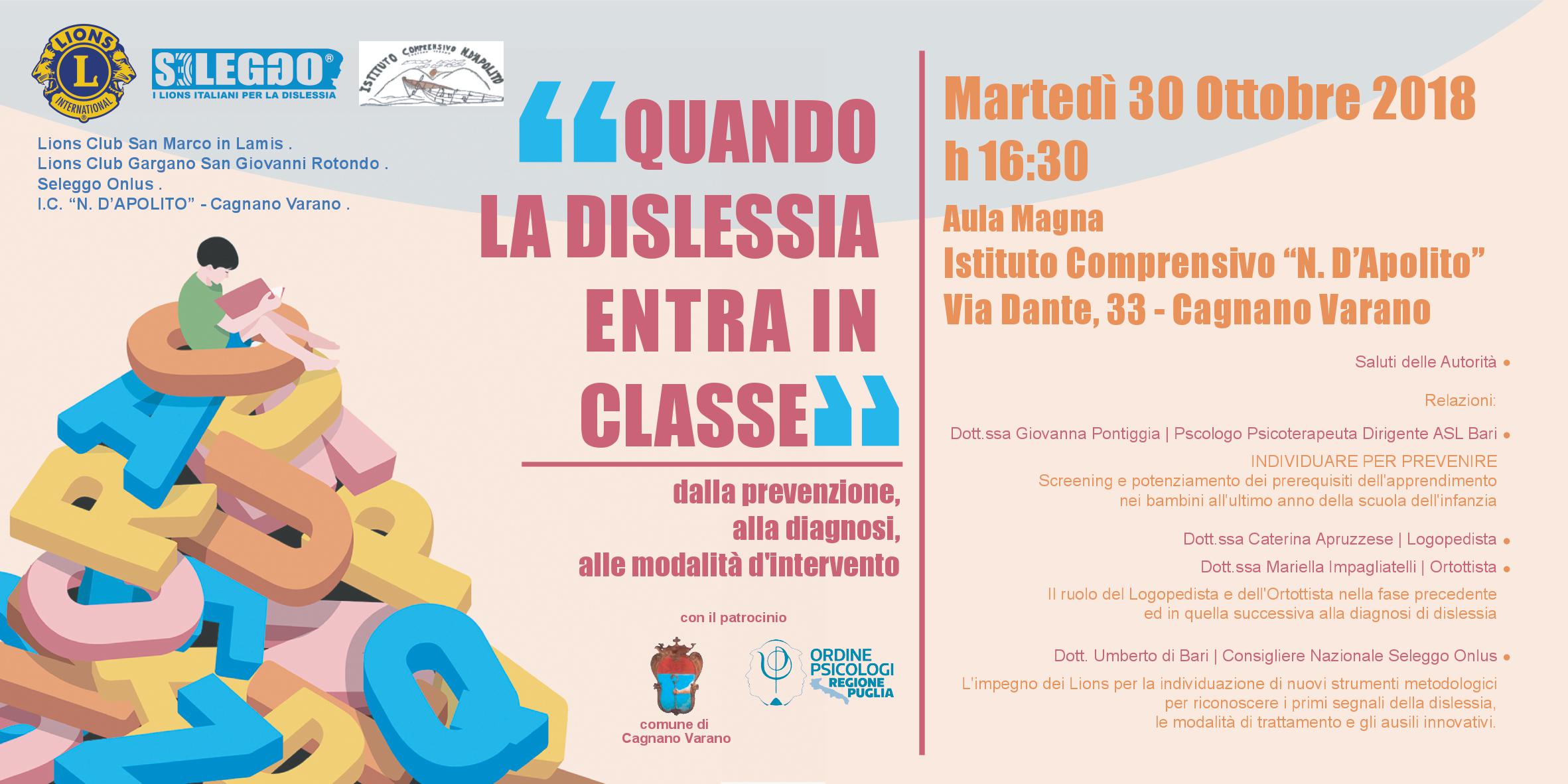 I Lions Club di San Marco in Lamis, San Giovanni Rotondo nell'ambito del SELEGGO Onlus - I Lions Italiani per la Dislessia, organizzano il seminario "Quando la dislessia...