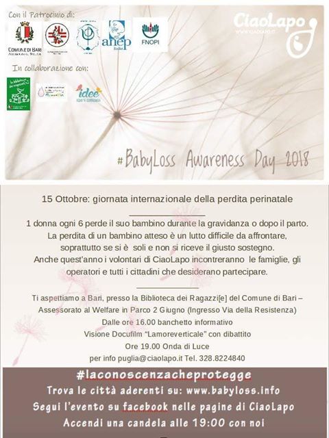 Ricorre oggi la Giornata mondiale sulla consapevolezza della morte perinatale - #Babyloss Awareness Day. L'Ordine degli Psicologi della Regione Puglia offre il suo patrocinio all'iniziativa promossa dall'Associazione CiaoLapo...