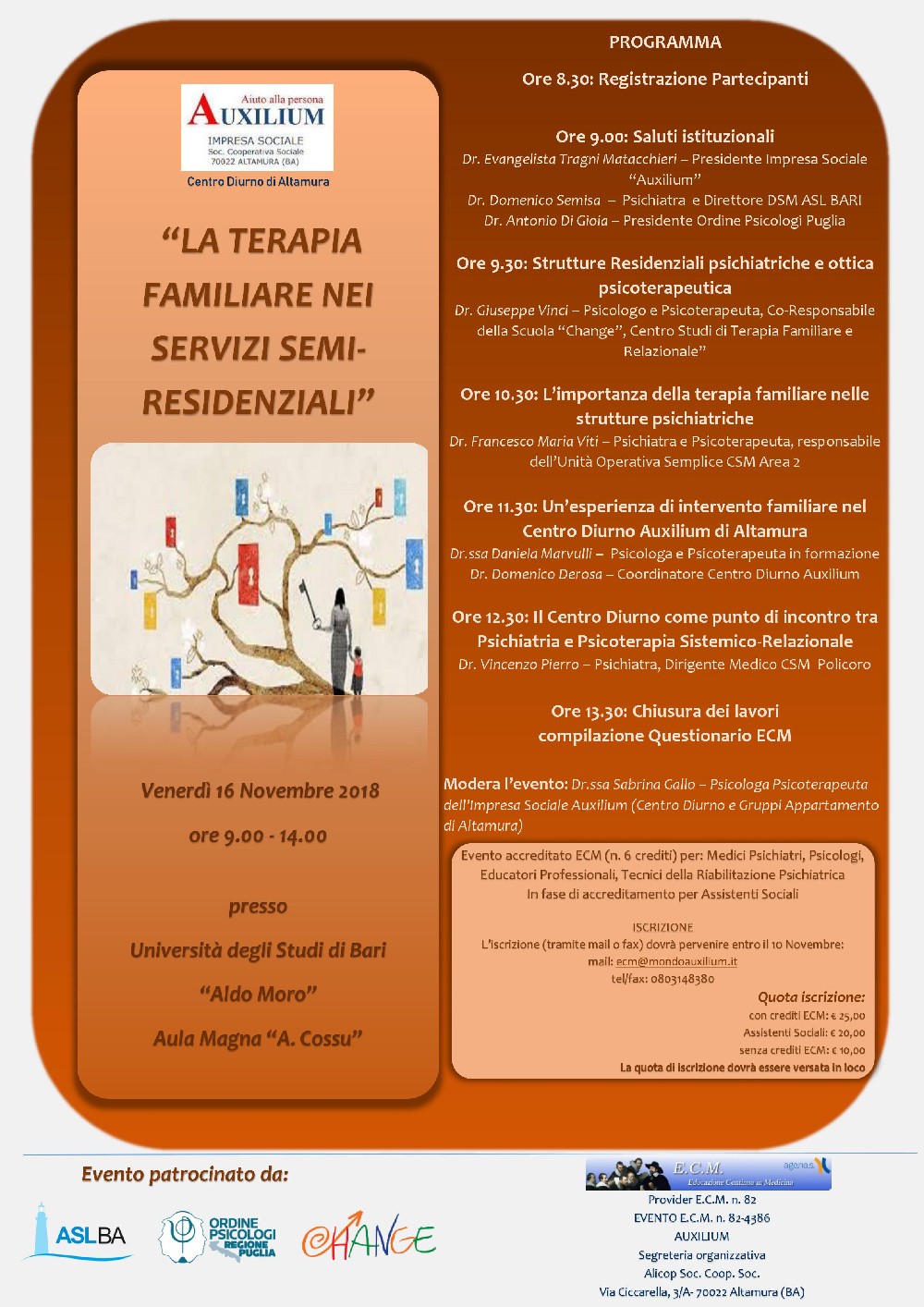 Il prossimo 16 novembre, dalle ore 9 alle 14, presso l'Aula Magna "A.Cossu" dell'Università degli Studi di Bari si svolgerà il convegno ECM "La terapia familiare nei servizi...