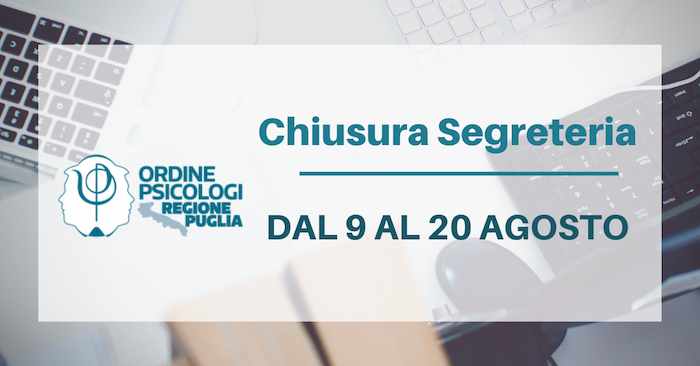 Si informano gli iscritti che gli uffici di segreteria saranno chiusi da lunedì 9 a venerdì 20 agosto per la pausa estiva.