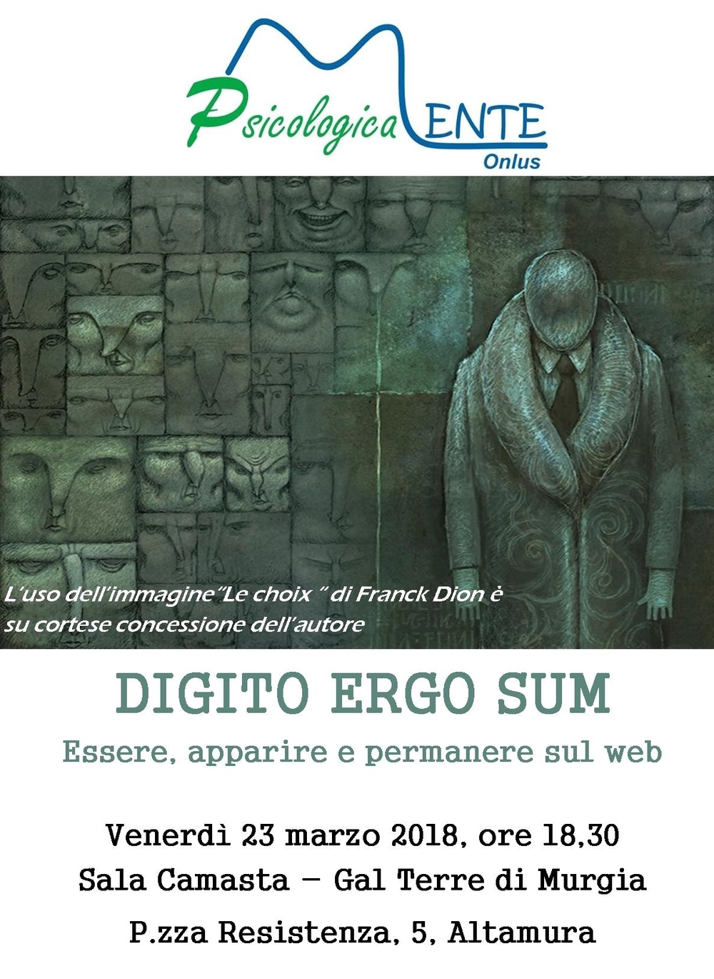 Il 23 marzo p.v. si terrà il convegno organizzato da PsicologicaMente Onlus e patrocinato dall'Ordine degli Psicologi della Regione Puglia dal titolo "Digito Ergo Sum: essere, apparire o...