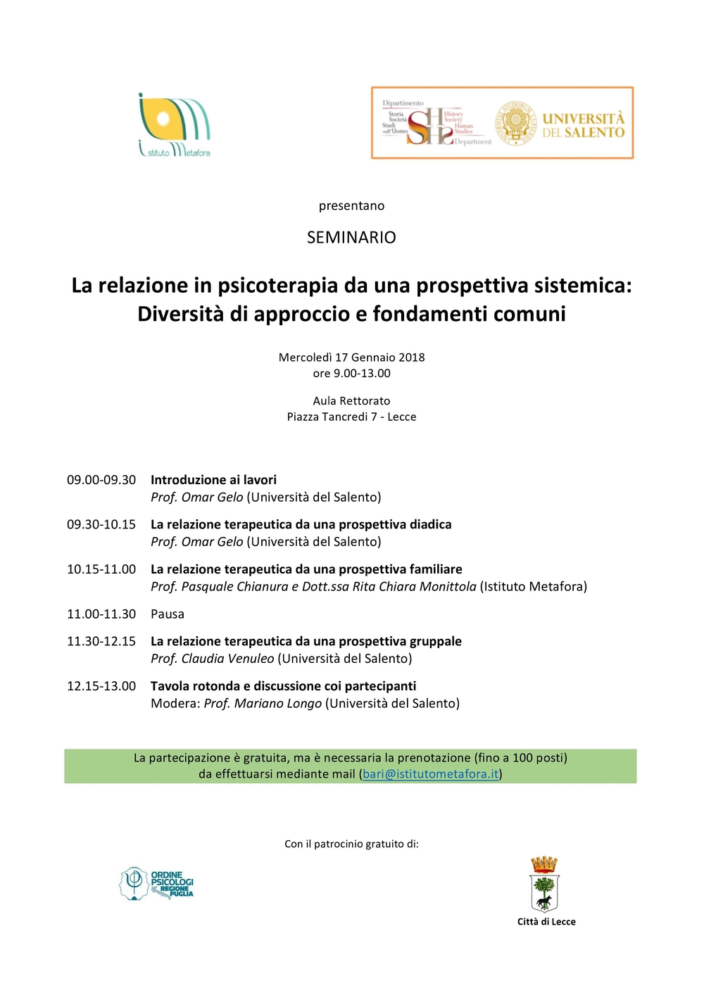 Segnaliamo il seminario organizzato dall'Istituto Metafora e dall'Unisalento, con il libero patrocinio dell'Ordine degli Psicologi di Puglia, sul tema "La relazione in psicoterapia da una prospettiva sistemica: diversità...