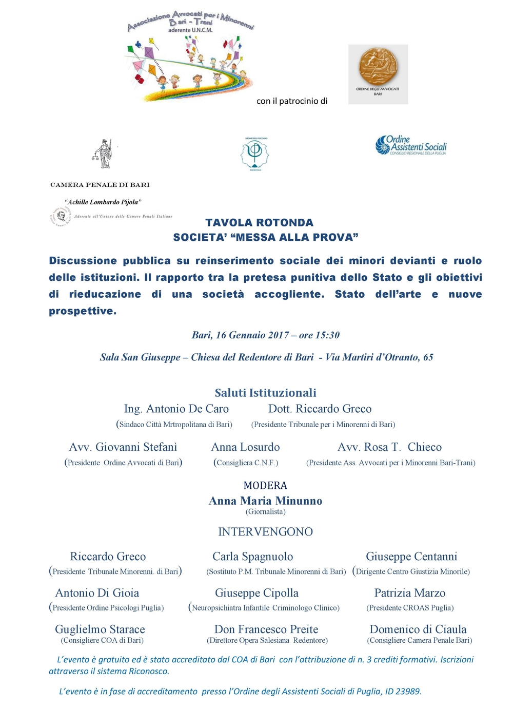 Il prossimo 16 gennaio, a partire dalle ore 15:30, si terrà a Bari la Tavola rotonda "Società messa alla prova" presso la Sala San Giuseppe della Chiesa del...