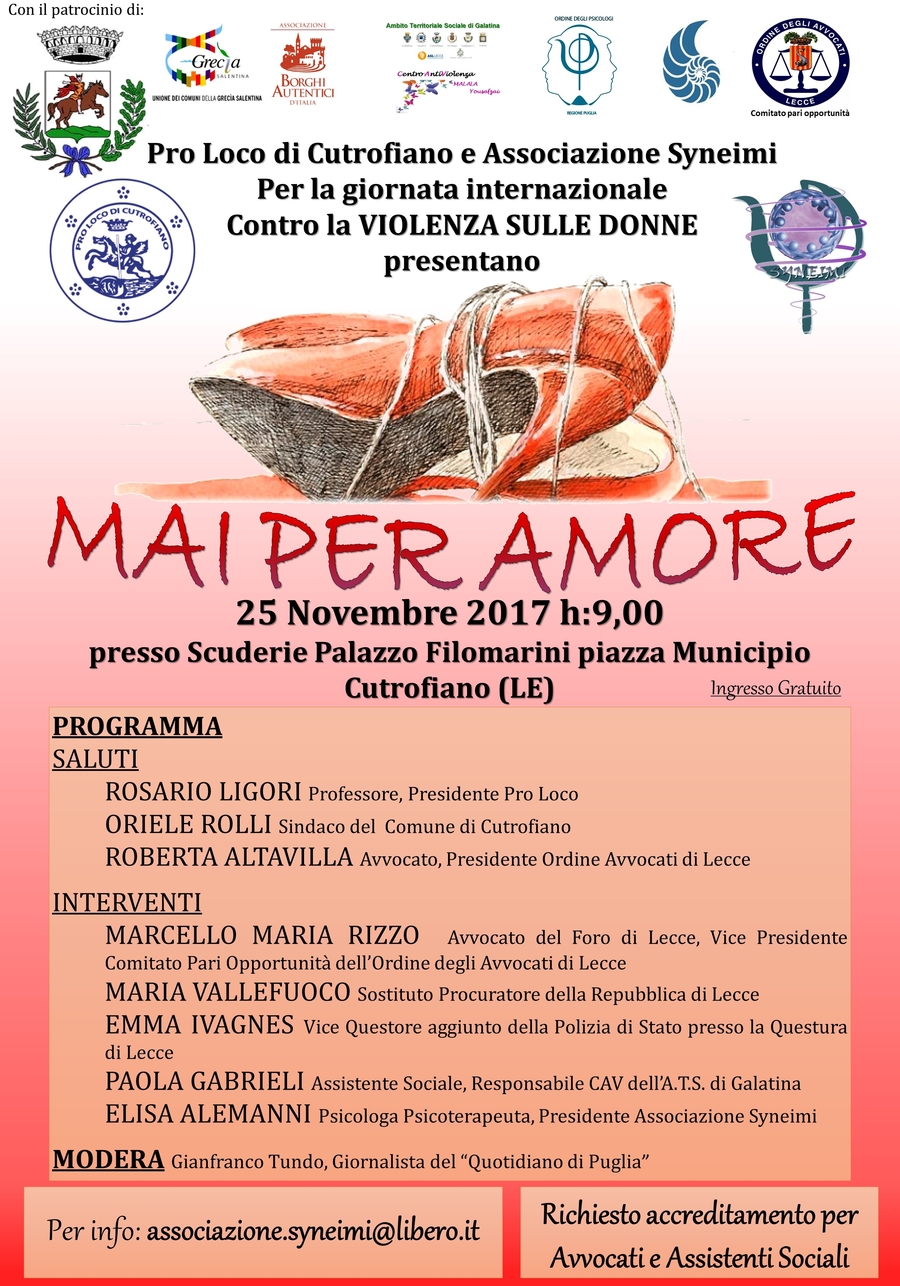In occasione della Giornata internazionale contro la violenza sulle donne, la Pro Loco di Cutrofiano e l'Associazione Syneimi organizzano l'evento patrocinato dall'Ordine dal titolo "Mai per amore". L'evento...