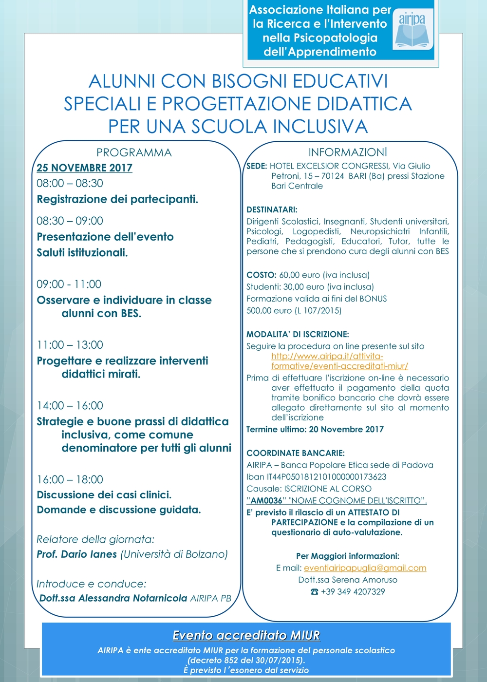 Segnaliamo il corso organizzato da AIRIPA (Associazione Italiana per la Ricerca e l'Intervento nella Psicopatologia dell'Apprendimento) per il 25 novembre presso l'Hotel Excelsiori di Bari. Il corso...