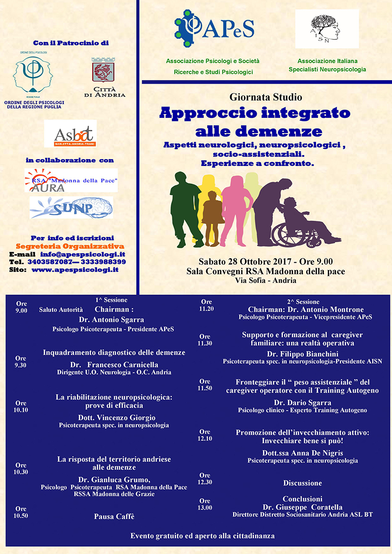 Segnaliamo la giornata di studio organizzata ad Andria dall'APeS e patrocinata dall'Ordine dal titolo "Approccio integrato alle demenze Aspetti neurologici, neuropsicologici, socio-assistenziali. Esperienze a confronto" che si terrà...
