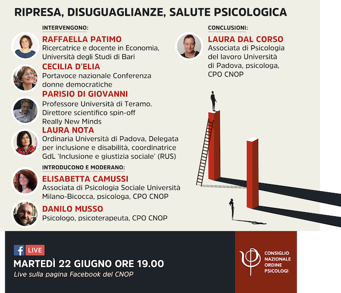 22 giugno ore 19.00 - Ripresa, Disuguaglianze, Salute Psicologica Intervengono Raffaella Patimo, Ricercatrice e docente in Economia, Università degli Studi di Bari Cecilia D'Elia, Portavoce nazionale Conferenza donne...