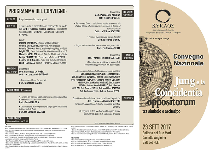 Segnaliamo il Convegno Nazionale "Jung e la Coincidentia oppositorium" organizzato dall'Associazione Junghiana Salentina di Gallipoli e patrocinato dall'Ordine degli Psicologi di Puglia. Durante l'evento che si svolgerà...