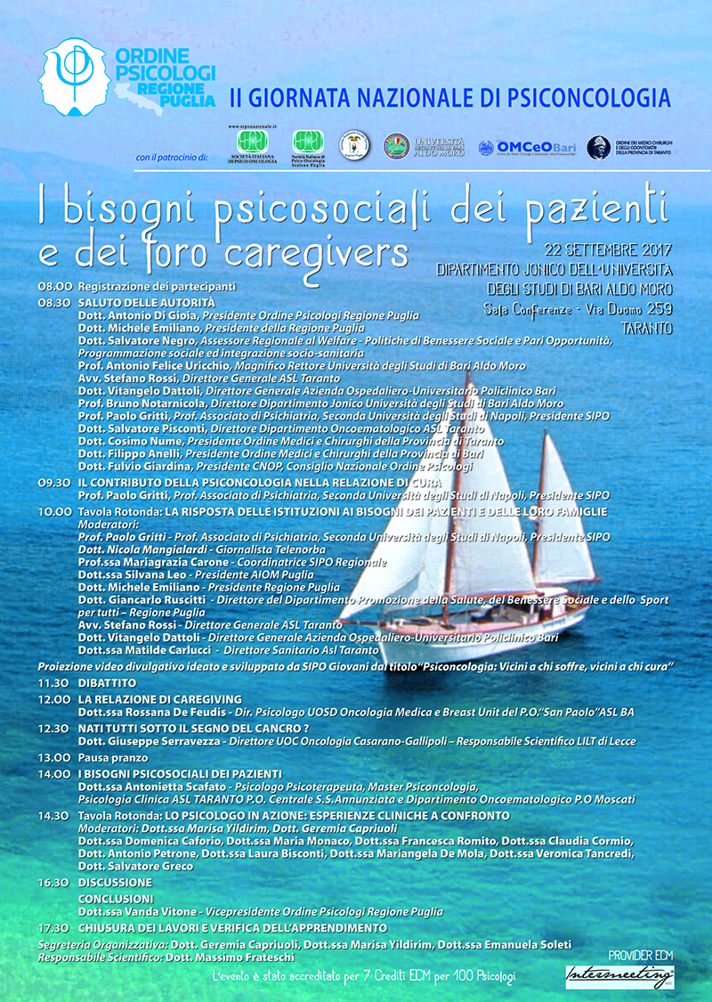 L'evento si terrà il 22 settembre 2017, a Taranto. L'evento rilascia 7 crediti ECM ai primi 100 Psicologi iscritti.