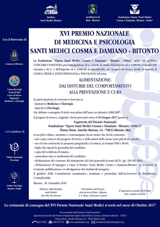 Premio Nazionale di Medicina e Psicologia – Santi Medici Cosma e Damiano Bitonto