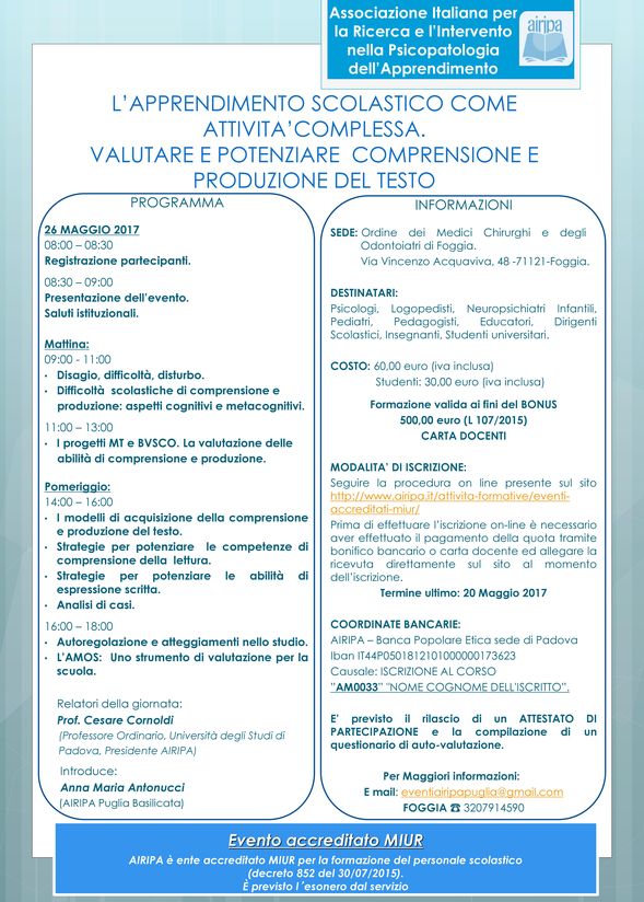 Per iscriversi all'evento "Apprendimento scolastico come attività complessa" Seguire la procedura online presente sul sito http://www.airipa.it/attivita-formative/eventi-accreditati-miur/ Termine ultimo per le iscrizioni: 20 Maggio 2017