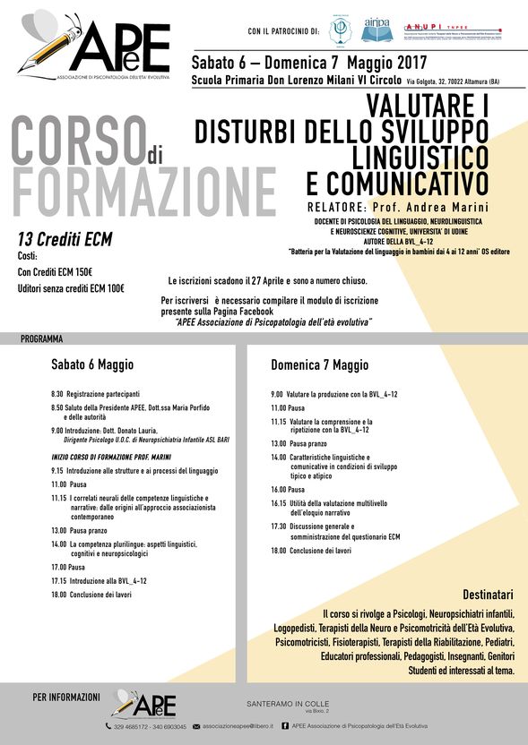 Il corso di formazione Valutare i disturbi dello sviluppo linguistico e comunicativo organizzato da APEE, l'Associazione di Psicopatologia dell'Età Evolutiva, si terrà il prossimo 6 e 7 maggio...