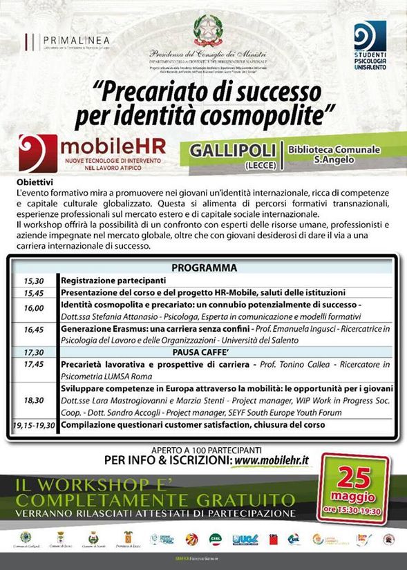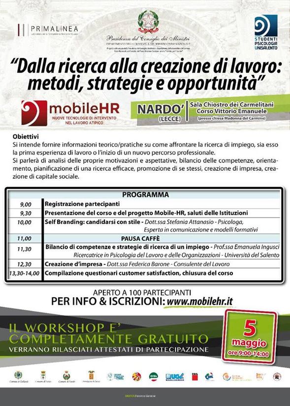 Proseguono le attività del Progetto Mobile-HR. Nuove tecnologie di intervento per il lavoro atipico. Cofinanziato dalla Presidenza del Consiglio dei Ministri e partner dell'Ordine degli Psicologi della Regione...
