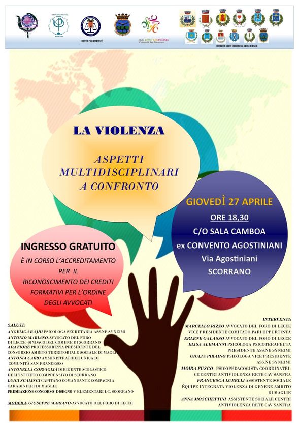 Il 27 aprile si terrà l'evento La violenza: aspetti multidisciplinari a confronto, dalle 18:30 presso la Sala Camboa di Scorrano (LE).