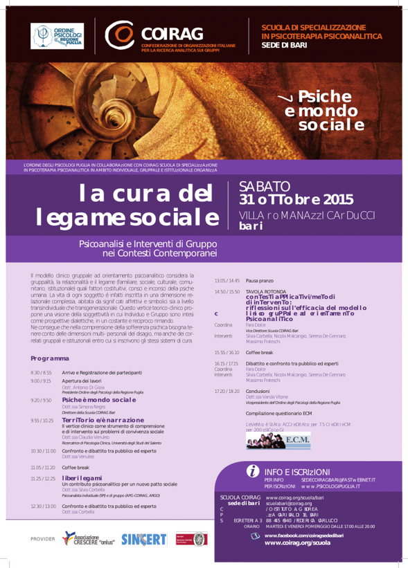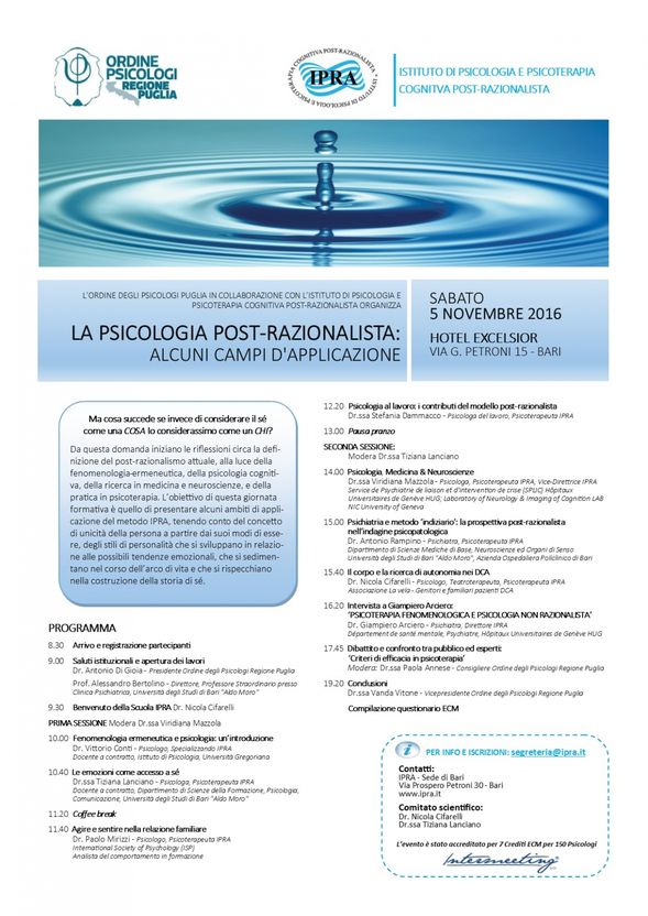 Evento patrocinato dall'Ordine degli Psicologi della Regione Puglia sul tema "La psicologia post-razionalista: alcuni campi d'applicazione".