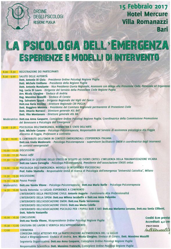 Si terrà a Bari il giorno 15 febbraio 2017 presso l’Hotel Mercure Villa Romanazzi il Convegno organizzato dall'Ordine degli Psicologi della Regione Puglia sul tema "LA PSICOLOGIA DELL’EMERGENZA: ESPERIENZE...