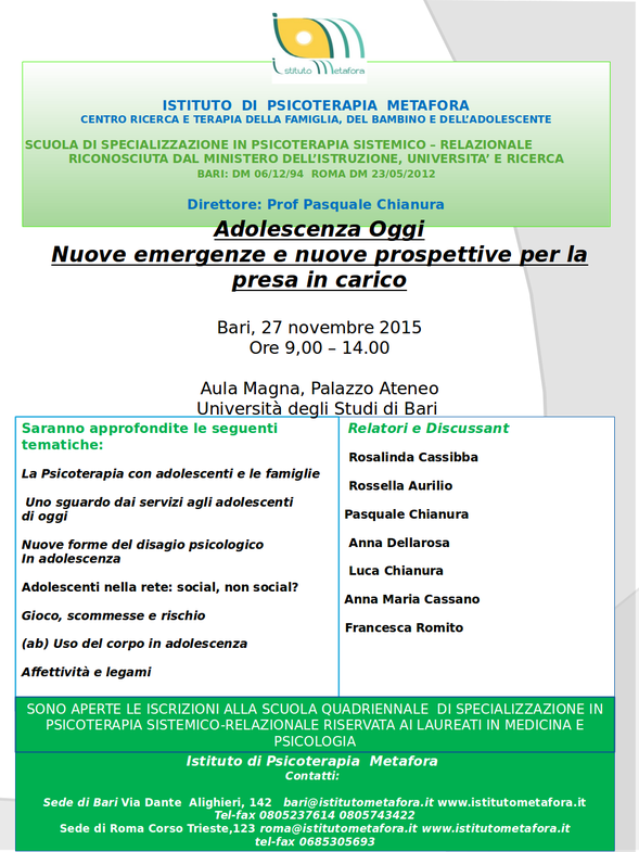 ISTITUTO DI PSICOTERAPIA METAFORA CENTRO RICERCA E TERAPIA DELLA FAMIGLIA, DEL BAMBINO E DELL’ADOLESCENTE SCUOLA DI SPECIALIZZAZIONE IN PSICOTERAPIA SISTEMICO – RELAZIONALE RICONOSCIUTA DAL MINISTERO DELL’ISTRUZIONE, UNIVERSITA’ E...