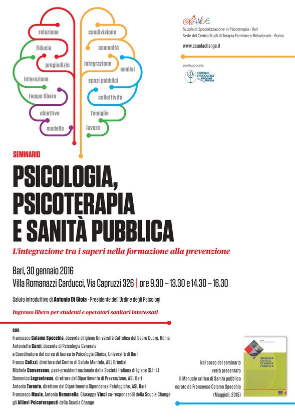 L'Ordine degli Psicologi della Puglia patrocina il seminario organizzato dalla Scuola di Specializzazione in Psicoterapia Change dal titolo "Psicologia, Psicoterapie e Sanità Pubblica" in programma sabato 30 gennaio...