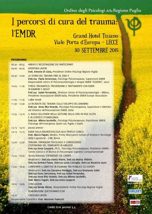 Il 30 settembre prossimo il Grand Hotel Tiziano di Lecce ospita il convegno organizzato dall'Ordine degli Psicologi della Puglia dal titolo "I percorsi di cura del trauma_ l'EMDR". ...