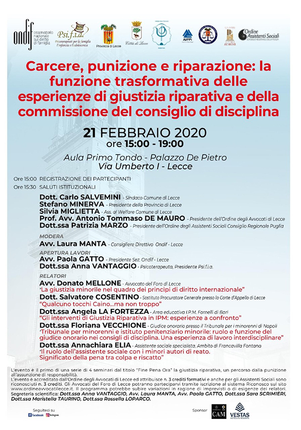 Siamo lieti di invitarvi all'evento patrocinato dall'Ordine degli Psicologi di Puglia dal titolo "Carcere, punizione e riparazione: la funzione trasformativa delle esperienze di giustizia riparativa e della commissione...