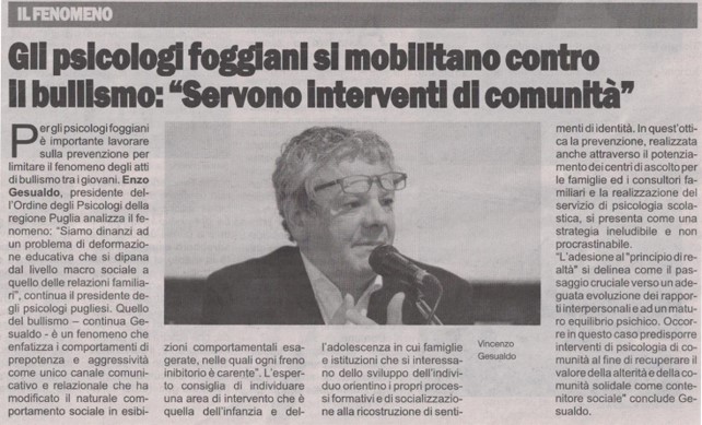 Per gli psicologi foggiani è importante lavorare sulla prevenzione per limitare il fenomeno degli atti di bulliscmo tra i giovani. Enzo Gesualdo, presidente dell'Ordine degli Psicologi della regione...