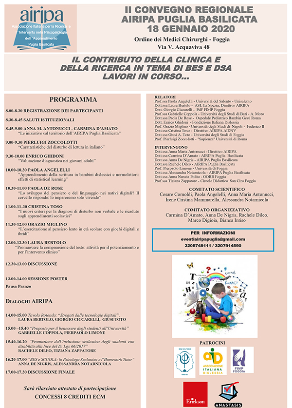 Evento patrocinato “Convegno Regionale AIRIPA PUGLIA BASILICATA – IL CONTRIBUTO DELLA CLINICA E DELLA RICERCA IN TEMA DI BES E DSA LAVORI IN CORSO…”
