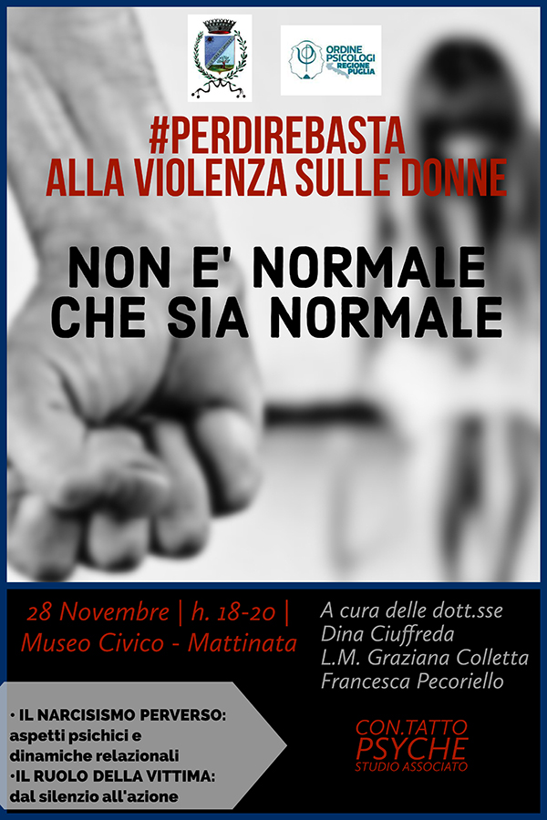 Vi invitiamo all'evento patrocinato dall'Ordine degli Psicologi Puglia dal titolo "Non è normale che sia normale", a cura delle dott.sse Dina Ciuffreda, L. M. Grazia Colletta e Francesca...