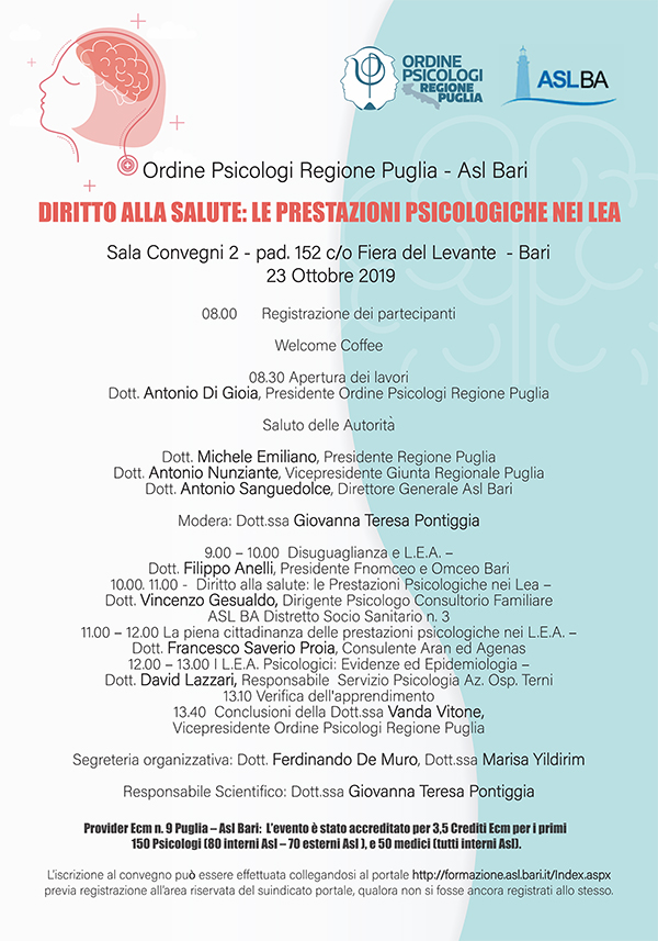 Vi invitiamo al Convegno organizzato dalla Asl di Bari in collaborazione con l’Ordine degli Psicologi della Regione Puglia, sul tema "Diritto alla salute: le Prestazioni Psicologiche nei Lea". ...