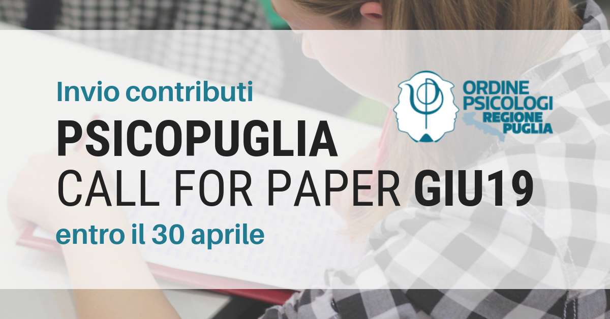 Carissimi colleghi, in prossimità dell’uscita di Giugno 2019 della rivista Psicopuglia, la Redazione è lieta di sollecitare e promuovere la proposta di contributi. Chiunque sia interessato può inviare...