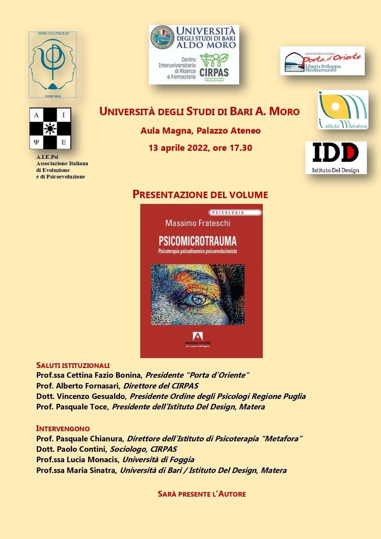 Vi invitiamo all'evento patrocinato dall'Ordine degli Psicologi Puglia: Presentazione del Volume “Psicomicrotrauma, Psicoterapia psicodinamica psicoevoluzionista” di Massimo Frateschi, che si terrà il giorno 13 aprile 2022, presso l’Aula Magna, Palazzo...