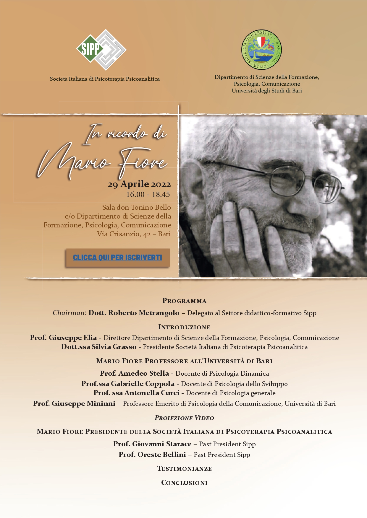 Vi invitiamo all’evento organizzato dalla Società Italiana di Psicoterapia Psicoanalitica insieme al Dipartimento di Scienze della Formazione, Psicologia, Comunicazione dell'Università degli studi di Bari, dal titolo "In ricordo di Mario...