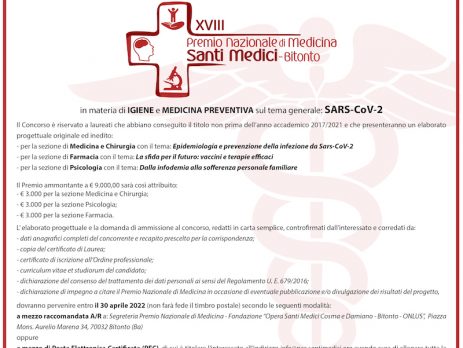 Si comunica il presente Bando XVIII Premio Nazionale di Medicina Santi Medici – Bitonto in materia di IGIENE e MEDICINA PREVENTIVA sul tema generale: SARS-CoV-2.