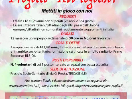Vi informiamo del progetto All Together. Mettiti in gioco con noi della Cooperativa Ciss (Cooperativa Sociale Interventi e Servizi Socio-Sanitari) di Tricase che mette a disposizione dei partecipanti ritenuti idonei un assegno mensile di 433,80 €, formazione in materia di sicurezza sul lavoro e in ambito socio-sanitario e formazione certificata in ambito sanitario (Primo Soccorso, BLS-D) per 12 mesi, per lo svolgimento del Servizio Civile.