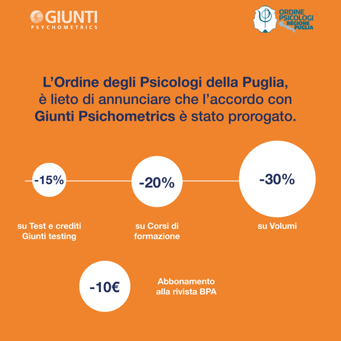 L'Ordine degli Psicologi Regione Puglia ha stipulato una Convenzione con GIUNTI PSYCHOMETRICS. Per gli iscritti all'albo della Regione Puglia è prevista una scontistica, come da documento allegato. È...