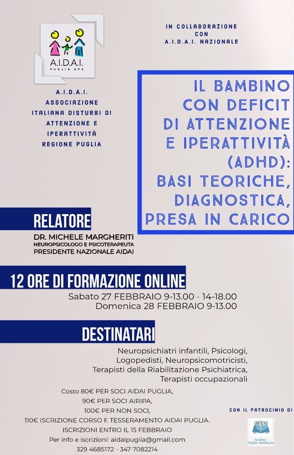 L'Ordine degli Psicologi Regione Puglia ha stipulato una Convenzione con il Corso di formazione di AIDAI PUGLIA dal titolo "Il Bambino con deficit di attenzione e iperattività (ADHD):...