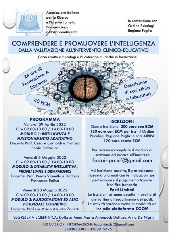 Convenzione dell’Ordine degli Psicologi Regione Puglia con il CORSO FAD “Comprendere e promuovere l’intelligenza” di AIRIPA