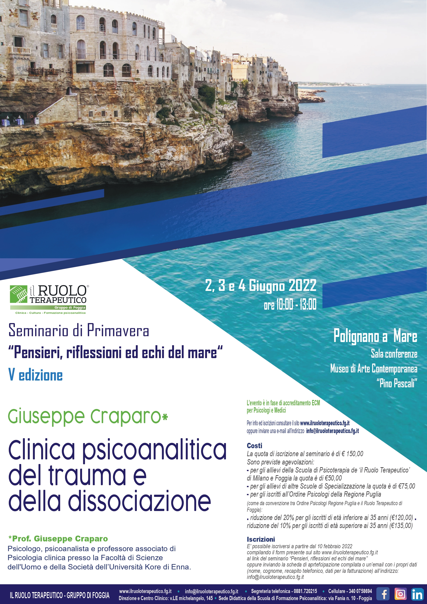 L’Ordine degli Psicologi Regione Puglia ha stipulato una Convenzione con il Seminario di primavera "Pensieri, riflessioni ed echi dal mare" V edizione – organizzato da IL RUOLO TERAPEUTICO -...