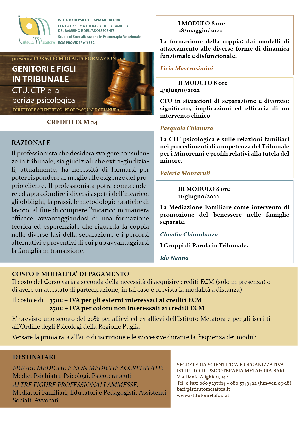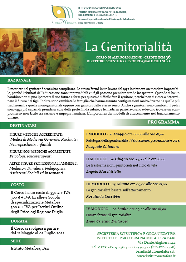 L’Ordine degli Psicologi Regione Puglia ha stipulato una Convenzione con il Corso di Alta Formazione: Genitori e figli in Tribunale CTU,CTP e la perizia psicologica. ECM 24, organizzato dall’Istituto Metafora. Quota...