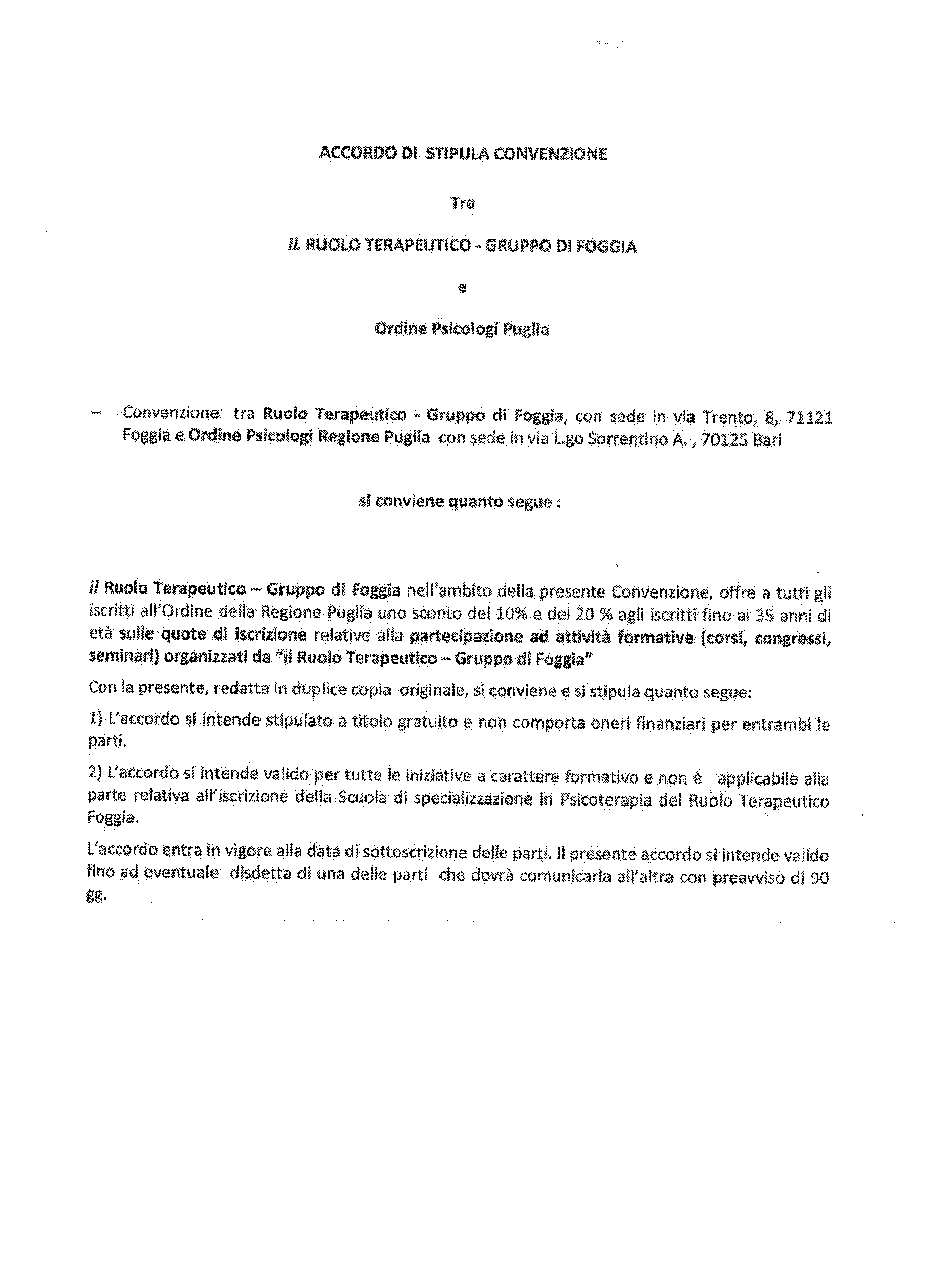 Si comunica il recente accordo di convenzione tra l’Ordine degli Psicologi della Regione Puglia e la Scuola “IL RUOLO TERAPEUTICO” di Foggia.