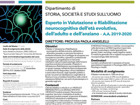 E’ stato il pubblicato il bando della II edizione del Master di II livello in Valutazione e Riabilitazione Neurocognitiva dell’età evolutiva, dell’adulto e dell’anziano a.a. 2019-2020 dell’Università del Salento. Sarà possibile iscriversi dal 15 giugno 2019.
