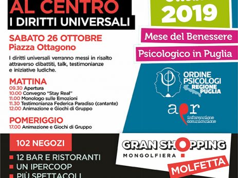 Vi invitiamo a partecipare all’evento sabato 26 ottobre 2019 nella piazza “Ottagono” del Gran Shopping Mongolfiera di Molfetta si terrà l’evento conclusivo del Mese del Benessere Psicologico promosso dall’Ordine degli Psicologi della Regione Puglia, dal titolo “Benessere al Centro”.