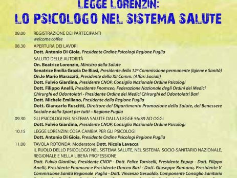 L’Ordine degli Psicologi della Regione Puglia organizzerà un evento dedicato a far luce sul decreto Lorenzin e sulle novità che esso comporta per la professione dello Psicologo. L’evento, Legge Lorenzin: lo Psicologo nel Sistema Salute, si terrà a Bari presso Villa Romanazzi Carducci in via G. Capruzzi 326, dalle ore 8 alle 13.30.