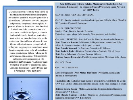 L’evento si terrà presso il Centro Diurno per l’Alzheimer “Porte del cuore”. Per info contattare il Centro all’indirizzo info@portedelcuore.it oppure ai seguenti recapiti telefonici 0832 1826214 – 320 6630898