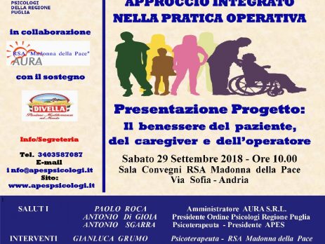 Presso la Sala Convegni RSA Madonna della Pace di Andria si svolgerà l’evento “Demenze: approccio integrato nella pratica operativa” a cura dell’APeS (Associazione Psicologici e Società) e patrocinato dall’Ordine e dalla Città di Andria.
