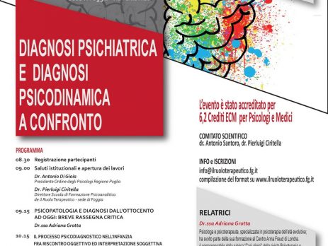 Il 23 febbraio p.v, presso la sala conferenza in via Fania 1 di Foggia, si svolgerà il convegno dal titolo “Diagnosi psichiatrica e diagnosi psicodinamica a confronto” organizzato da Il Ruolo Terapeutico di Foggia e patrocinato dall’Ordine degli Psicologi della Regione Puglia.