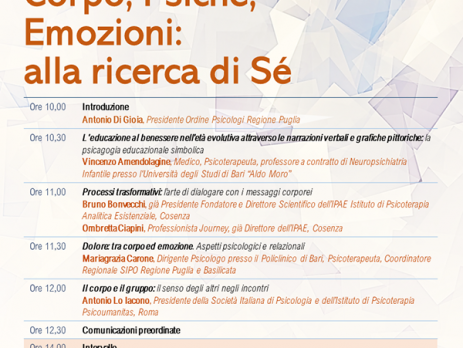 Venerdì 18 ottobre 2019 siamo lieti di invitarvi al convegno “Corpo, Psiche, Emozioni: alla ricerca di Sé”, che si svolgerà presso l’Hotel Palace a Bari, dalle ore 10.00 alle ore 18.00.
