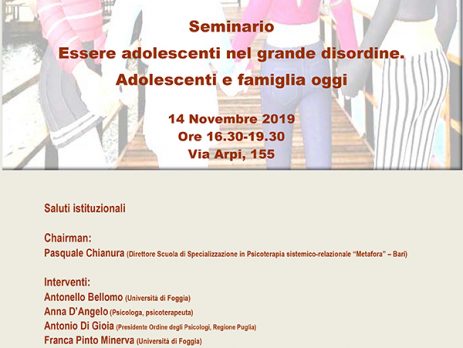 Vi invitiamo al Seminario “Essere adolescenti nel grande disordine. Adolescenti e famiglia oggi”, che si terrà il 14 novembre 2019, presso il Dipartimento di Studi Umanistici, Lettere, Beni Culturali e Scienze dell’Educazione dell’Università di Foggia, dalle ore 16:30 alle ore 19:30.