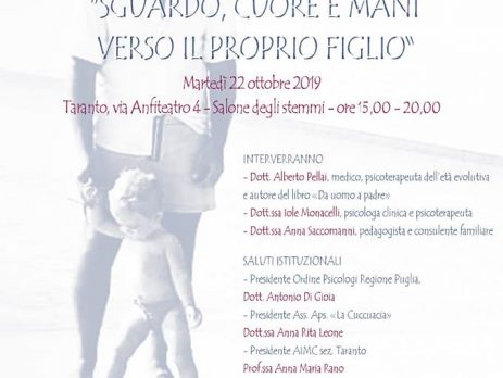 Vi invitiamo martedì 22 ottobre 2019 al Convegno di Formazione dal titolo: “Paternità…Sguardo, Cuore e Mani verso il Proprio Figlio”, che si svolgerà presso il Salone degli stemmi, in via Anfiteatro 4 a Taranto.